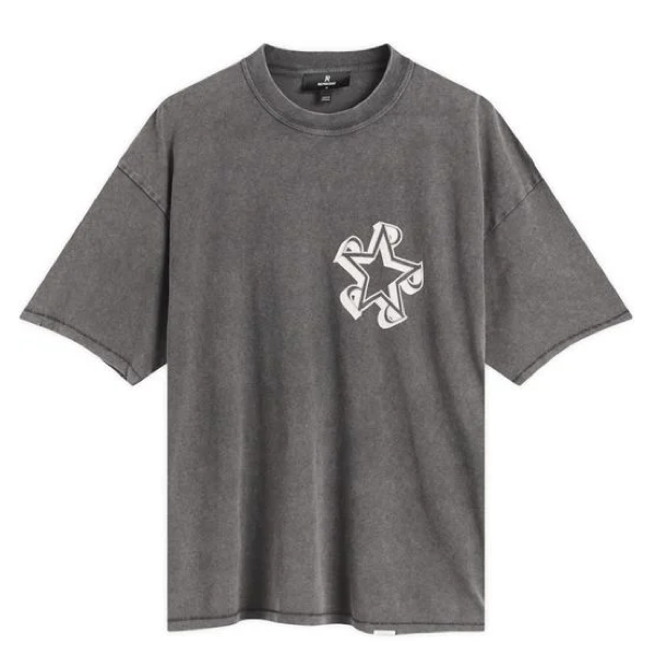 Introducing the Initial Star T-Shirt in Vintage Grey, crafted from a cotton-hemp blend at 160GSM with an oversized fit. The t-shirt features a bold puff print Initial Star graphic to the chest, paired with vintage-inspired ladder stitch finishing at the hem and cuffs. Subtle nibbling distressing enhances the worn-in character, while our signature metal bar accents the hem.