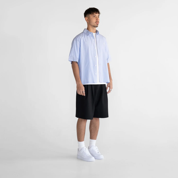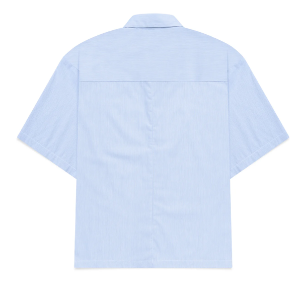 Crafted from 100% cotton, this short-sleeve button-up shirt features finely detailed blue and white stripes, offering a crisp yet relaxed look. The breathable fabric ensures comfort in warm weather, while the boxy cut gives it a contemporary, versatile fit that transitions effortlessly from casual outings to more refined occasions.