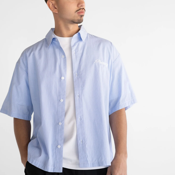 Boxy Script Shirt in Sky Blue. The perfect shirt for this Australian Spring/Summer period as it offers the perfect blend of laid-back/casual yet timeless in design.