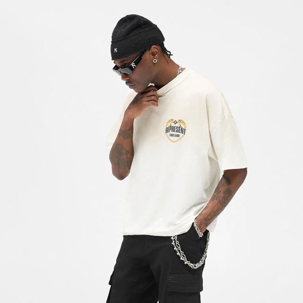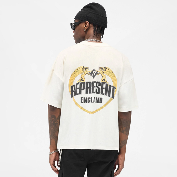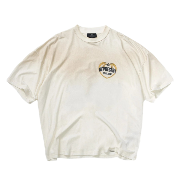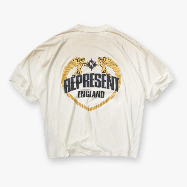 Introducing the Angel Border T-Shirt in Washed Ecru, cut from a cotton-hemp blend jersey with a boxy silhouette. The t-shirt is designed with a cracked print, ribbed collar, and subtle distressing at the hems, finished with cover stitch detailing and the Represent metal bar.