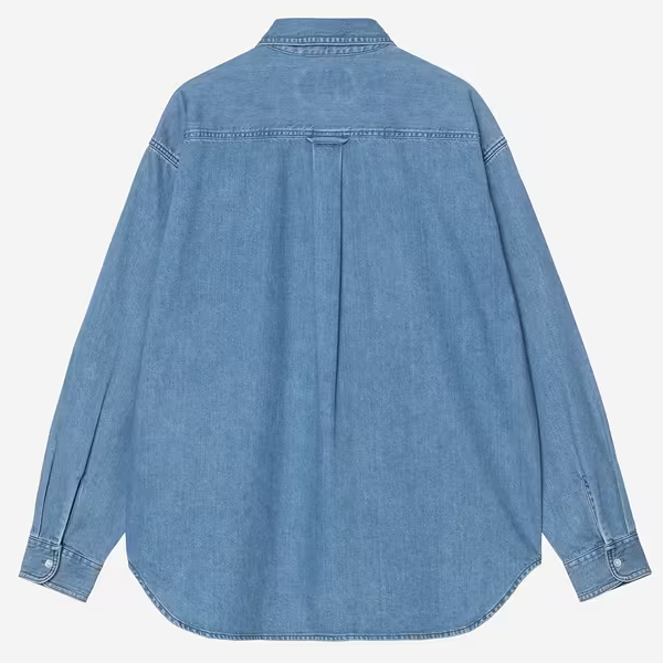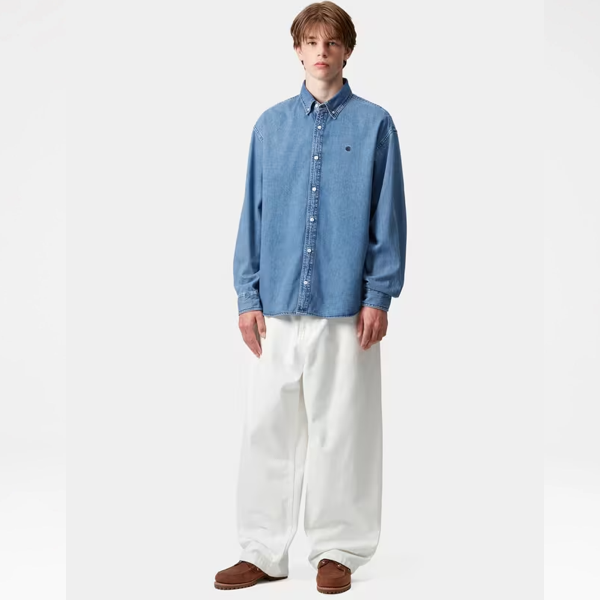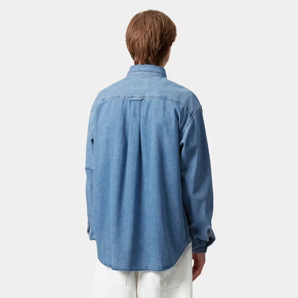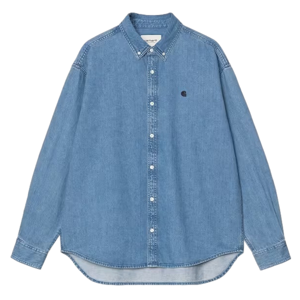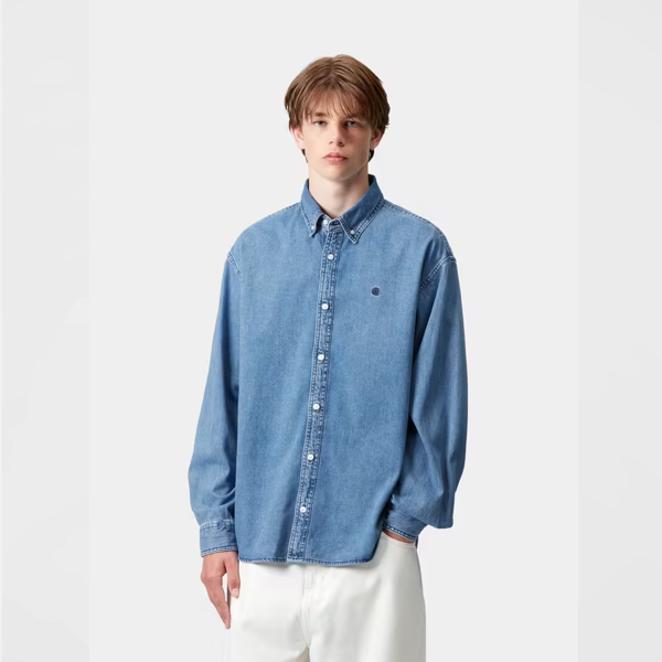 The L/S Lucas Shirt is made in a loose fit from midweight cotton denim. The item also has a buttoned front and collar. A woven 'C' Logo appears on the chest.